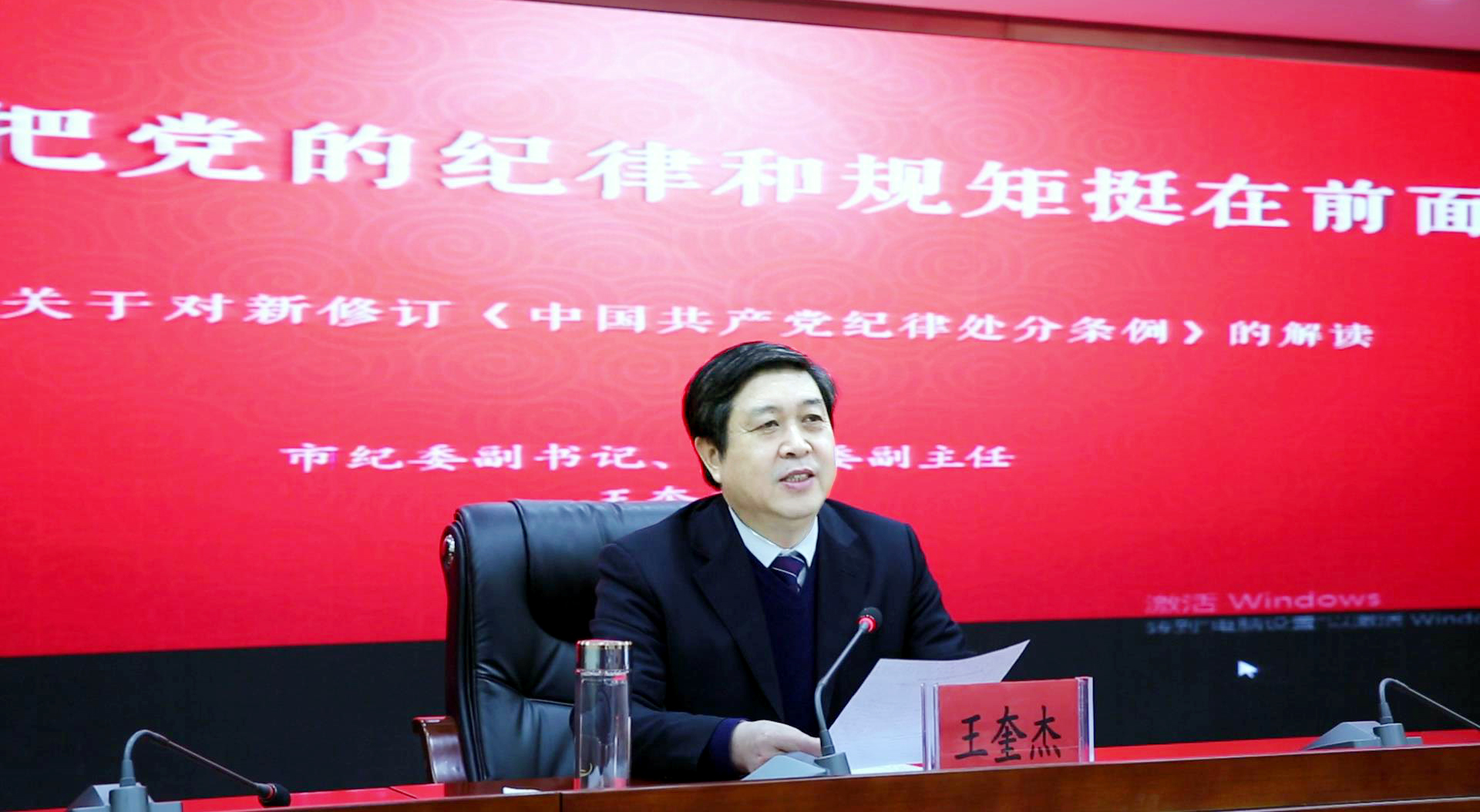 1月17日上午,集團(tuán)公司舉辦學(xué)習(xí)貫徹新修訂的《中國共產(chǎn)黨紀(jì)律處分條例》專題輔導(dǎo)報(bào)告會(huì)。邀請(qǐng)市紀(jì)委副書記、市監(jiān)委副主任王奎杰對(duì)新《條例》進(jìn)行輔導(dǎo)解讀,市國資委副主任許峰出席報(bào)告會(huì)。集團(tuán)公司黨委書記、董事長楊龍主持并講話。