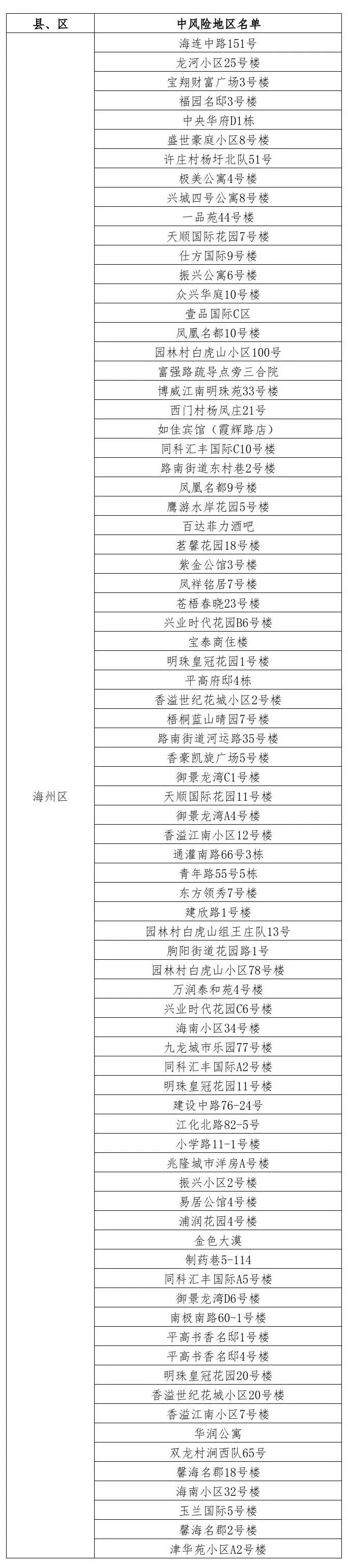 根據(jù)國務院聯(lián)防聯(lián)控機制有關規(guī)定,經(jīng)市指揮部研究決定,自發(fā)布之日起,對我市部分區(qū)域疫情風險等級進行調(diào)整:海州區(qū)眾興華庭7號樓、悅城國際9號樓、香溢世紀花城小區(qū)7號樓、許莊村楊圩北隊75號、極美苑2號樓、頤和花園1號樓、麻紡小區(qū)10號樓、銀城公寓1號樓、新建西路30號樓、仕方國際10號樓、吾悅?cè)A府9號樓由中風險地區(qū)調(diào)整為低風險地區(qū)。其他地區(qū)風險等級不變。調(diào)整后全市現(xiàn)有79個中風險地區(qū)。