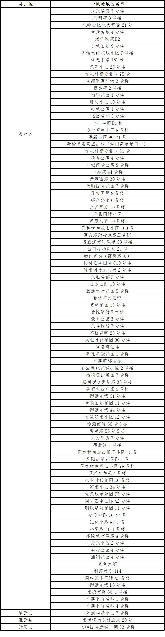 根據(jù)國務(wù)院聯(lián)防聯(lián)控機制有關(guān)規(guī)定,經(jīng)綜合評估研判,市指揮部決定,自發(fā)布之日起,將海州區(qū)浦潤花園4號樓、金色大漠、制藥巷5-114、同科匯豐國際A5號樓、御景龍灣D6號樓、南極南路60-1號樓、平高書香名邸1號樓、平高書香名邸4號樓調(diào)整為中風(fēng)險地區(qū)。其他地區(qū)風(fēng)險等級不變。調(diào)整后全市現(xiàn)有89個中風(fēng)險地區(qū)。