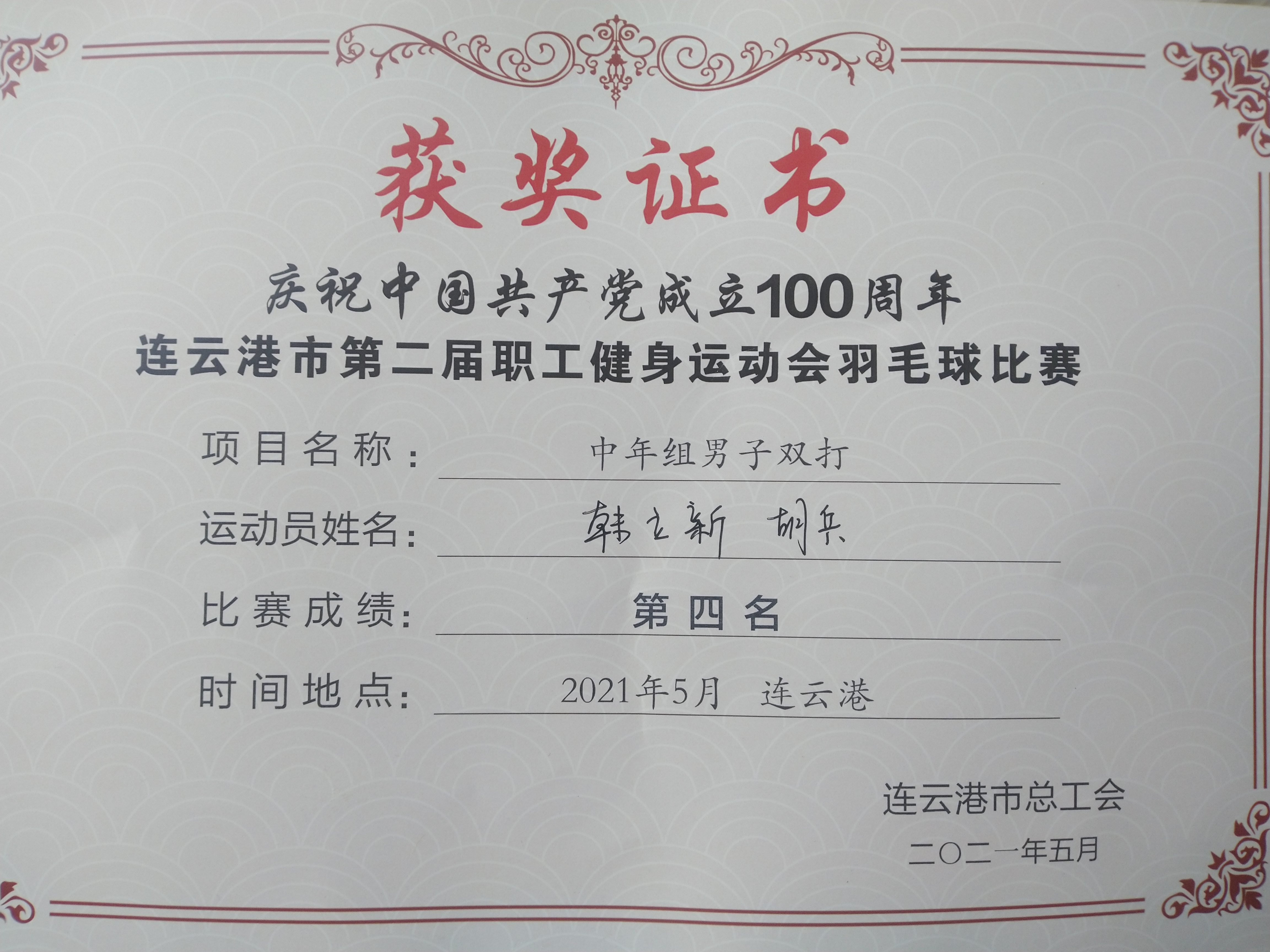 5月28-29日,市第二屆職工健身運(yùn)動(dòng)會(huì)羽毛球比賽在振興李寧羽毛球館舉辦,來自全市34支代表隊(duì),293名選手參賽。經(jīng)過激烈角逐,韓立新、胡兵在中年男子雙打比賽中取得了第四名的好成績。