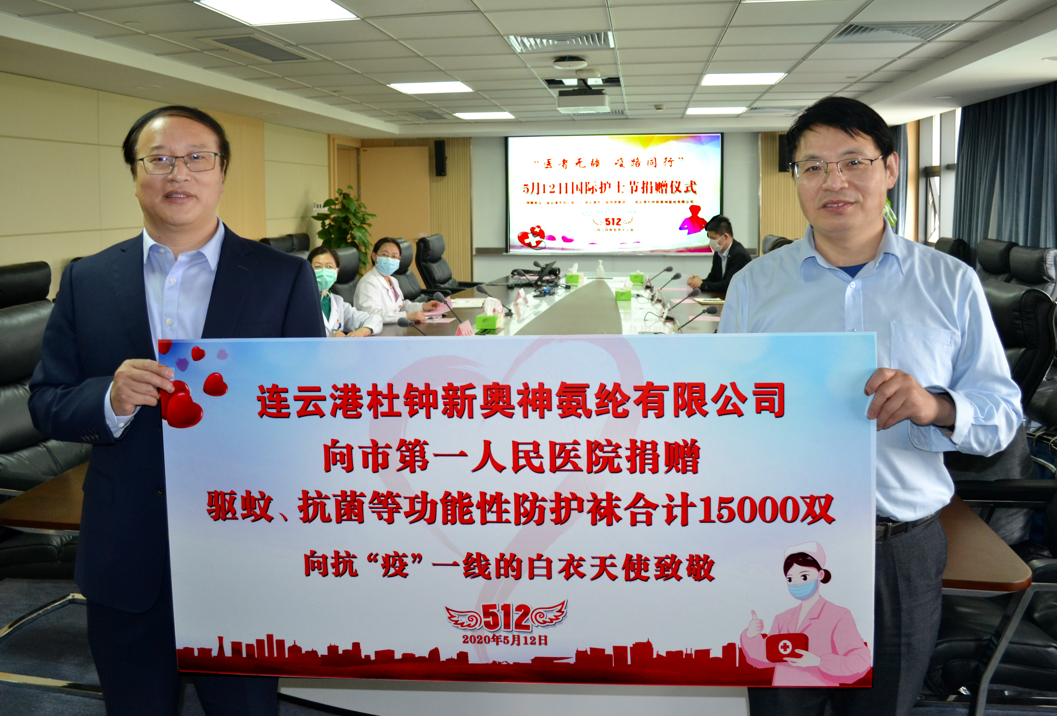 5月12日國際護士節(jié),連云港杜鐘氨綸有限公司來到連云港市第一人民醫(yī)院開展愛心捐贈活動,共計捐贈功能性絲襪15000雙。市總工會副主席秦云、集團工會主席劉承志、市一醫(yī)工會主席胡蓉,副院長李明星,氨綸公司總經(jīng)理張斌出席捐贈儀式。