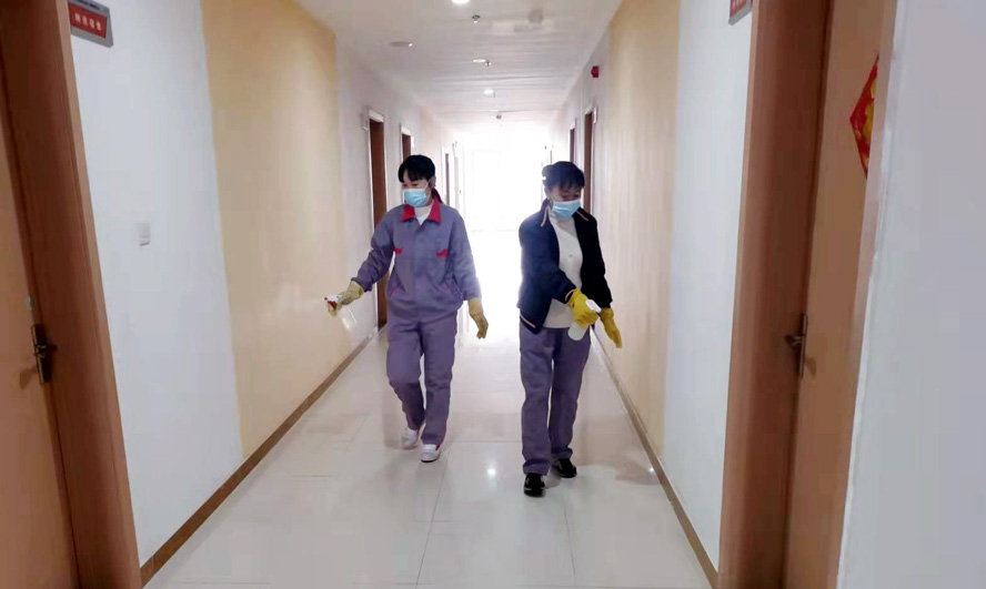 干凈整潔的辦公樓、宿舍樓里飄著淡淡的消毒水味道,清瘦干練的保潔員任禮勤正在仔細(xì)地打掃著樓道。5號疫情突發(fā)之時(shí)她正好當(dāng)班,根據(jù)以往疫情經(jīng)驗(yàn),她果斷地把一直照料著的年邁母親安排給了大哥,此后便堅(jiān)守在工作崗位上。疫情防控期間的工作量增加了不少,每天她和同事們分片作業(yè),在認(rèn)真做好各自清潔區(qū)每日兩次的保潔、消毒工作的同時(shí),還要負(fù)責(zé)就餐人員一日三餐的登記、測量體溫等工作。每天從早上7點(diǎn)開始,5位保潔員的身影便忙碌在公司的門廳、餐廳、樓道、電梯等場所,這一忙常常要到晚上6點(diǎn)多?!罢埬肯麦w溫”“今天你做核檢了嗎”,這些溫馨的話語幾乎成了她們對大家的問候語。