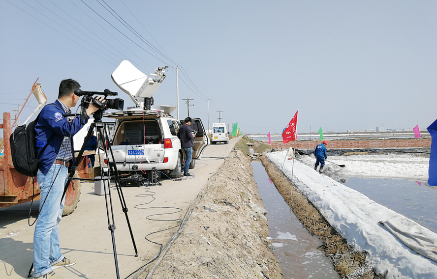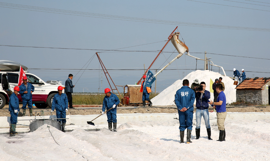 攝制組動(dòng)用直播車、航拍、信號(hào)傳輸+高清攝像機(jī)等設(shè)備,工作人員各有分工,同步拍攝鹽田生產(chǎn)、鹽工勞動(dòng)以及食鹽生產(chǎn)等淮鹽收獲的喜人畫面,記者更是在鏡頭的一路跟拍下,一邊自己動(dòng)手操作,一邊與現(xiàn)場(chǎng)勞動(dòng)的鹽工親切交談,向觀眾詳細(xì)解讀生態(tài)淮鹽灘曬生產(chǎn)和食鹽生產(chǎn)的工藝流程,為大家熟悉、了解和保護(hù)淮鹽提供一次直觀的認(rèn)知機(jī)會(huì)。