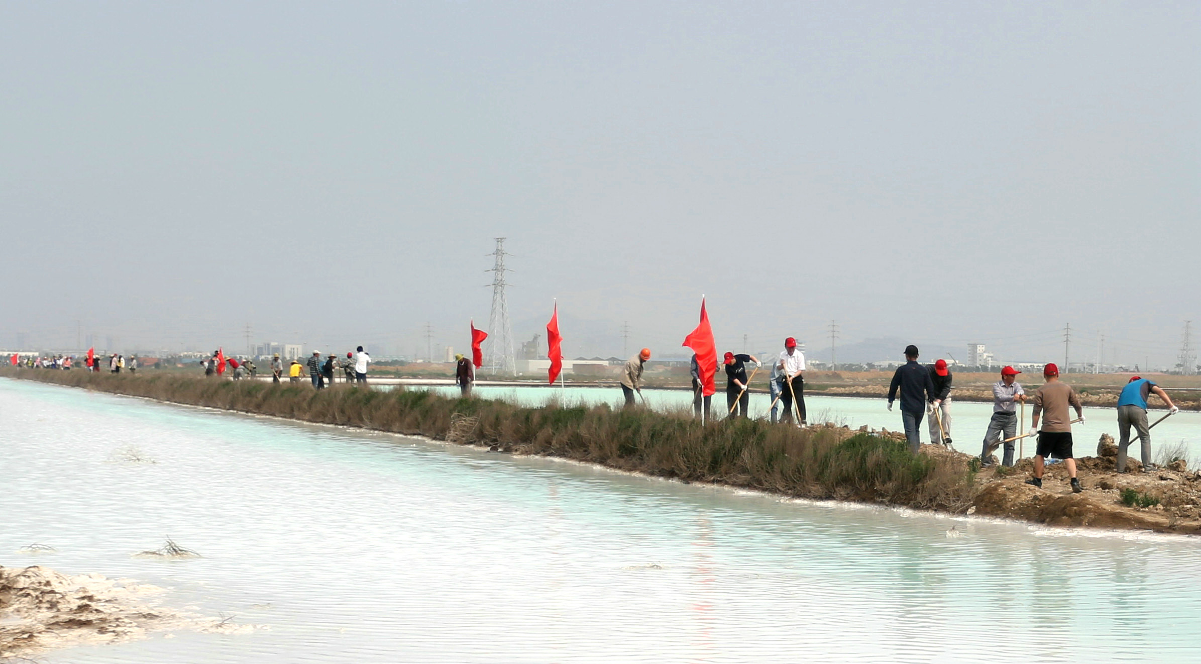 6月13日下午,來自公司機(jī)關(guān)第一、第二黨支部及臨達(dá)公司、海州灣公司、金臺公司、海濱工區(qū)等六個黨支部的百余名黨員志愿者,自行解決交通工具和勞動工具,頂著炎炎烈日,齊聚242省道北側(cè)1公里處的臨達(dá)公司新建鈣液輸送管道現(xiàn)場,“一”字型排開,在近600米的溝堰上展開管道鋪設(shè)溝道回填土工程,場面蔚為壯觀。