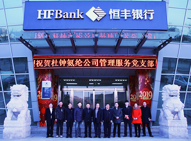 2019年1月16日,杜鐘氨綸公司管理服務(wù)黨支部赴恒豐銀行開展黨建結(jié)對共建交流活動(dòng)。此次共建活動(dòng)由公司總經(jīng)理張斌、副書記王克平帶隊(duì),恒豐銀行行長劉偉陪同。