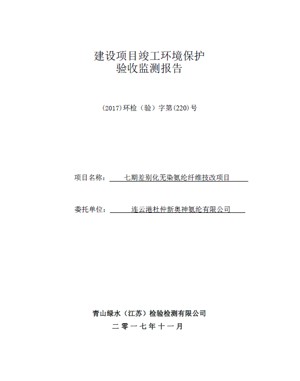 七期差別化無(wú)染氨綸纖維技改項(xiàng)目竣工環(huán)境保護(hù)驗(yàn)收監(jiān)測(cè)報(bào)告