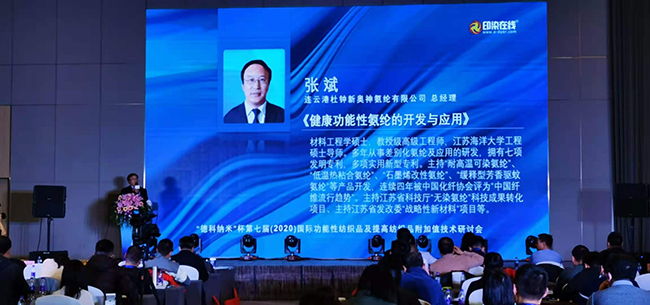 12月4日,由印染在線主辦的“乘風破浪·智匯紡織”第七屆(2020)國際功能性紡織品及提高紡織品附加值技術(shù)研討會在杭州舉行。公司總經(jīng)理張斌帶隊參加了本次大會,并做了題為《健康功能性氨綸的開發(fā)和應(yīng)用》的報告。
