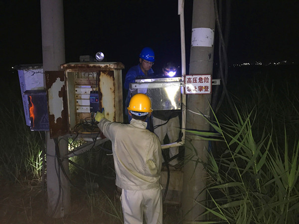 7月30日晚,臺南供電所員工在蒿西養(yǎng)殖區(qū)緊急處理由于過負荷導(dǎo)致的配電箱電表線路故障。入伏以來,連云港氣溫居高不下,電網(wǎng)負荷持續(xù)走高,7月30日晚21點,由于用電負荷突增,蒿西養(yǎng)殖區(qū)發(fā)生配電箱電表線路故障,接到報修電話后,該所值班工作人員迅速備件,冒著高溫、悶濕的條件下進行緊急搶修。圖為工作人員正在安裝配電箱電表接線。此次新招2名實習(xí)員工也參加了該項搶修任務(wù)。截止當晚11時蒿西養(yǎng)殖區(qū)及其周邊已送電成功。