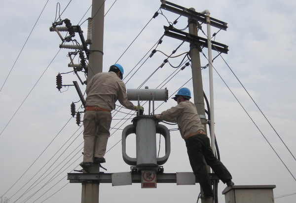 圖為該所職工在黃下線養(yǎng)殖場公變進(jìn)行檢修
