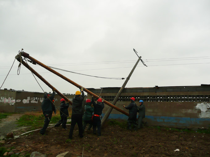 2月3日(正月初九)早上五點多,臺北供電所電力搶修值班室電話急促響起,變電所操作工反映10KV太和線跳閘失電。10KV太和線是臺北供電所非常重要的一條供電線路,是向順天木業(yè)、蘇交集團、市政瀝青等大型企業(yè)供電的重要通道,失電意味著企業(yè)生產(chǎn)停工。接警后,供電所外線組組長孫忠青立刻帶人沿線全面檢查。經(jīng)過兩個小時的排查,終于發(fā)現(xiàn)處于線路末端的高速公路低壓線路的五根電桿被施工的挖掘機 撞斷拉折。獲此情況,所領(lǐng)導(dǎo)立即組織人員,準備材料,協(xié)調(diào)吊車,安排運送電桿。這時天空正下著小雨,更增加了施工的難度。為了盡快搶修,恢復(fù)供電,搶險隊伍加速向事發(fā)地點開進,寒風(fēng)中的雨滴,打在職工的頭上臉上,大家毫不在意,一心撲在搶修線路上。運送電桿的道路泥軟地陷,機器吊裝遇到死角,他們就肩扛手拉。為了搶時間,爭速度,他們中午就在工地吃點快餐。在全體職工的共同努力下,到下午五點左右全面完成了搶險工作。