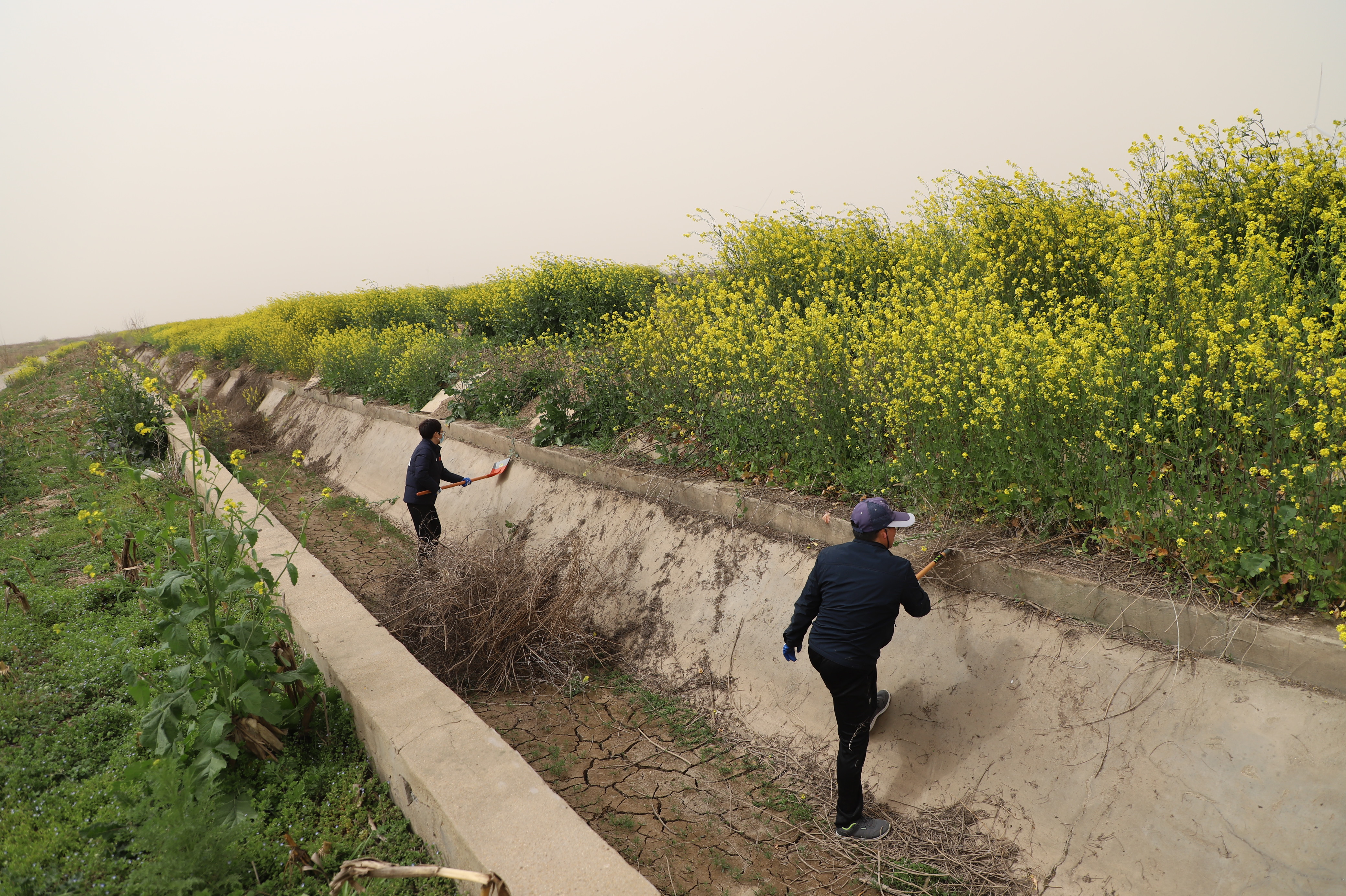 下午13:00,大家準(zhǔn)時(shí)出發(fā)前往活動(dòng)地點(diǎn)。到達(dá)活動(dòng)場(chǎng)地,在機(jī)關(guān)黨總支書記莊忠明的帶領(lǐng)下,分成三個(gè)組行動(dòng),大家發(fā)揚(yáng)不怕臟、不怕累的精神,積極參與,他們手拿鐮刀、鐵锨等工具,相互協(xié)作,黨員紛紛擼起袖子加油干,有的除雜草、有的撿垃圾,你前我后,一個(gè)跟著一個(gè)腳步走,認(rèn)真仔細(xì)地清理送水道里的各類垃圾、雜草等雜物,不放過(guò)任何一個(gè)死角。經(jīng)過(guò)一個(gè)下午近4小時(shí)的努力,將3000余米的送水渠道的雜草、垃圾等雜物全部清理完畢。