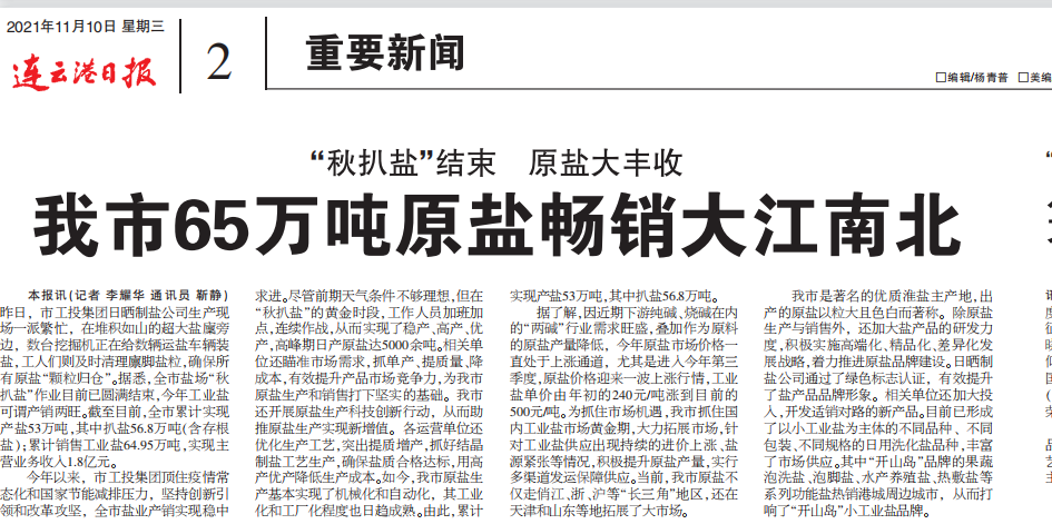 連云港日?qǐng)?bào)刊登:我市65萬噸原鹽暢銷大江南北