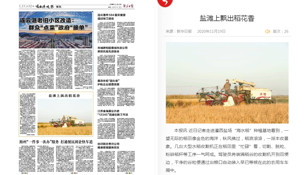 近日記者走進灌西鹽場“海水稻”種植基地看到,一望無際的稻田像金色的海洋,秋風(fēng)拂過,稻浪滾滾,一派豐收景象。幾臺大型水稻收割機正在稻田里“忙碌”著,切割、脫粒、粉碎稻稈等工序一氣呵成。駕駛員將裝滿稻谷的收割機開到田埂邊,干凈的谷粒便通過出糧口自動裝入早已等候在此的農(nóng)用車車廂中。