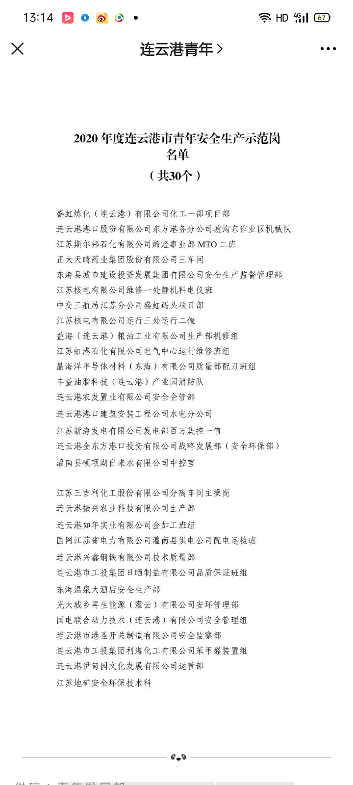 11月12日,共青團(tuán)連云港市委員會公布2020年度連云港市青年安全生產(chǎn)示范崗名單,連云港市工投集團(tuán)日曬制鹽公司品質(zhì)保證班組被評為2020年度連云港市青年安全生產(chǎn)示范崗。
