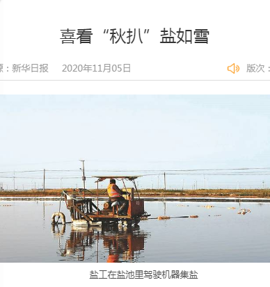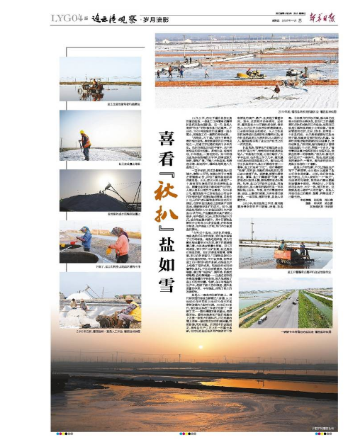 “今天這個(gè)鹽池,正好扒的海鹽。海鹽是我們千年的傳承,我們每年保留了5萬噸海鹽。海鹽吃起來香,因?yàn)樗然c含量在96%左右,剩下的都是微量元素,尤其是含鎂量比較高。這5萬噸海鹽,賣價(jià)并不比礦鹽高,但這是我們淮鹽的根。我們對(duì)海鹽有感情、有需要,所以仍然保留它?!比諘裰汽}新河分公司經(jīng)理安樹林,作為省勞模,他帶領(lǐng)鹽工們不斷進(jìn)行技術(shù)革新,在淮鹽生產(chǎn)上創(chuàng)造了很多成果。輕型自吸式電動(dòng)履帶扒鹽機(jī)、半自動(dòng)式管道架、電動(dòng)活碴器、唐三零“油改電”、循環(huán)纜、機(jī)械式破碴耙、自動(dòng)解繩器……正是這些聽起來晦澀難懂的專有名詞,極大地減輕了鹽工們的勞動(dòng)量。創(chuàng)新,在千年淮鹽的生產(chǎn)中,起到了減少勞動(dòng)強(qiáng)度、提升鹽質(zhì)量的作用。千年淮鹽,體現(xiàn)了極大的發(fā)展韌性。