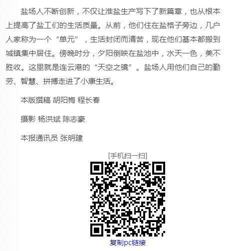 鹽場(chǎng)人不斷創(chuàng)新,不僅讓淮鹽生產(chǎn)寫下了新篇章,也從根本上提高了鹽工們的生活質(zhì)量。從前,他們住在鹽格子旁邊,幾戶人家稱為一個(gè)“單元”,生活封閉而清苦,現(xiàn)在他們基本都搬到城鎮(zhèn)集中居住。傍晚時(shí)分,夕陽倒映在鹽池中,水天一色,美不勝收。這里就是連云港的“天空之鏡”。鹽場(chǎng)人用他們自己的勤勞、智慧、拼搏走進(jìn)了小康生活。