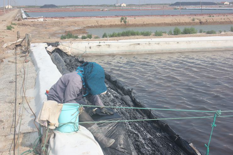 我們首先來(lái)到新河制鹽分公司十二班,映入我眼簾的是一位女工頭頂烈日坐在灘頭認(rèn)真修補(bǔ)塑料布,她用毛巾將破損地方擦拭干凈,待水漬干透,涂抹上膠水,再將一塊新的布粘貼上去,技藝十分嫻熟。