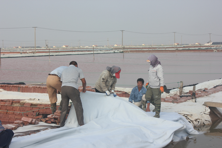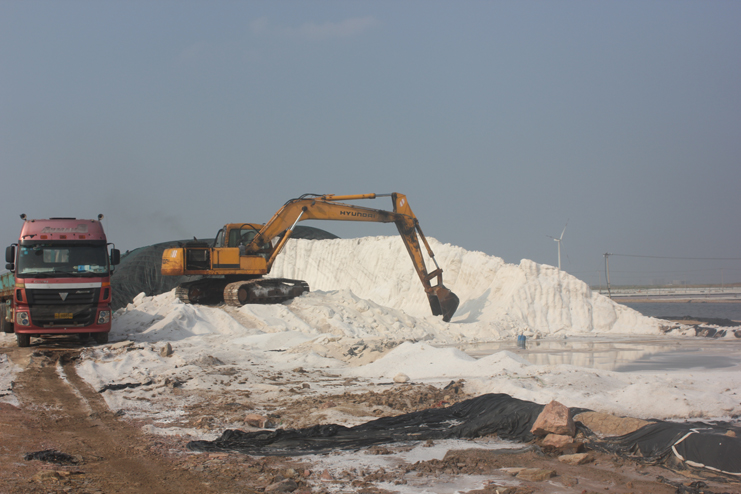 隨后我們又來(lái)到了新河制鹽分公司十四班的裝鹽現(xiàn)場(chǎng)。一位工人操作著挖掘機(jī),往卡車上裝鹽銷售,如今裝鹽實(shí)現(xiàn)了機(jī)械化,工人的勞動(dòng)負(fù)荷也減輕了許多。在埒南制鹽分公司的五班,我們看到七八個(gè)工人正在灘頭更換土工布,他們一字排開(kāi),先將土工布鋪開(kāi),然后分工合作,有的人負(fù)責(zé)把布理齊鋪平,有的則把磚頭鋪放在布上用來(lái)固化。