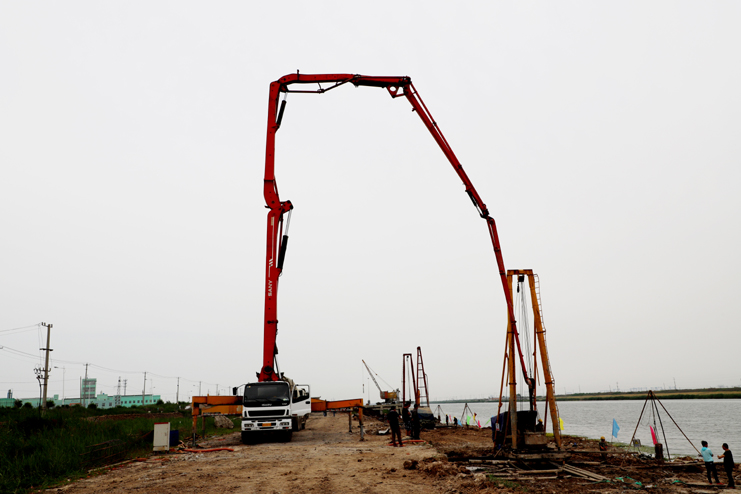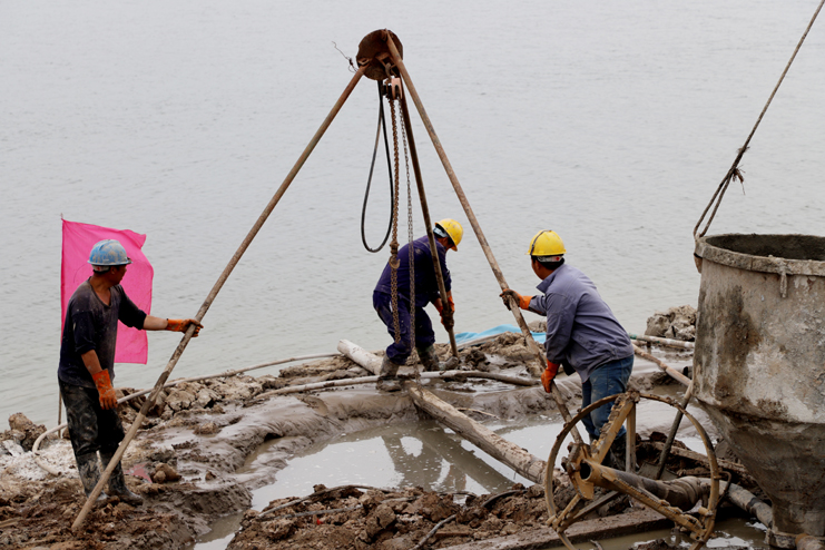 5月30日下午,藍(lán)色的天空沒有一絲云彩,火熱的太陽(yáng)炙烤著大地。在灌西投資公司五灌河碼頭擴(kuò)建項(xiàng)目建設(shè)工地,施工人員正在各司其職的工作著,有的在使用電鋸,有的在壓鋼筋,還有的在焊接鋼筋框架。遠(yuǎn)處一臺(tái)混凝土澆灌機(jī)在進(jìn)行混凝土澆灌作業(yè),碼頭岸邊大小打樁機(jī)器一字排開,筆者親身感受五灌河碼頭二期工地開發(fā)建設(shè)的火熱場(chǎng)面。