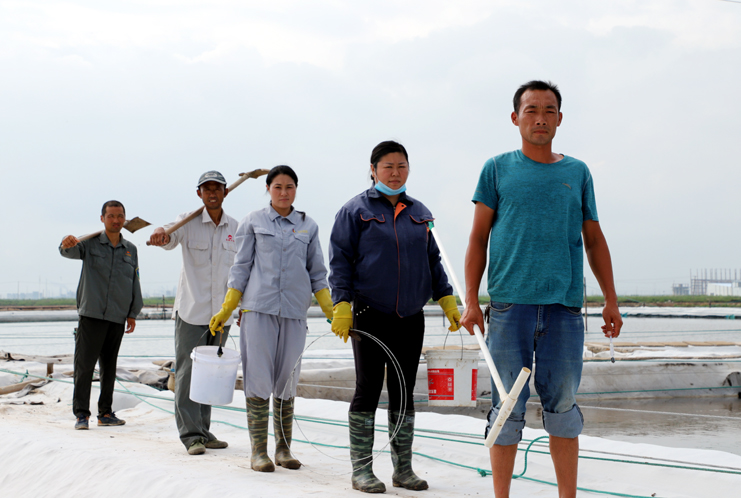 8月15日早,在制鹵區(qū)2班,班長王春好帶著班組的工人準(zhǔn)備干活,安排好每個(gè)人的工作后,大家拿起工具上灘,工人們分散開來,各自忙著手里的活。工人們前后排開,彎腰俯身,用鐵鍬挖溝做堰,為下雨排淡水做好準(zhǔn)備。“踩在鹵水里能感覺像是在“燙腳”,太陽把鹵水曬的滾燙的。”領(lǐng)灘手王春好用衣袖擦著臉上的汗水說,自己在灘上干了有七、八年了,對于這樣的工作環(huán)境已經(jīng)適應(yīng)了。進(jìn)入八月以來,連續(xù)7天最高溫度達(dá)到35以上,臺風(fēng)過后,今天的氣溫也達(dá)到了33度,令今年這個(gè)夏天,成為有完整氣象記錄最熱的夏天。跑水工仇海濱,到灘上一個(gè)多小時(shí),以是大汗淋漓,他帶領(lǐng)工人做一些修堰、補(bǔ)塑布、緊繩、還有查跑道頭的活。