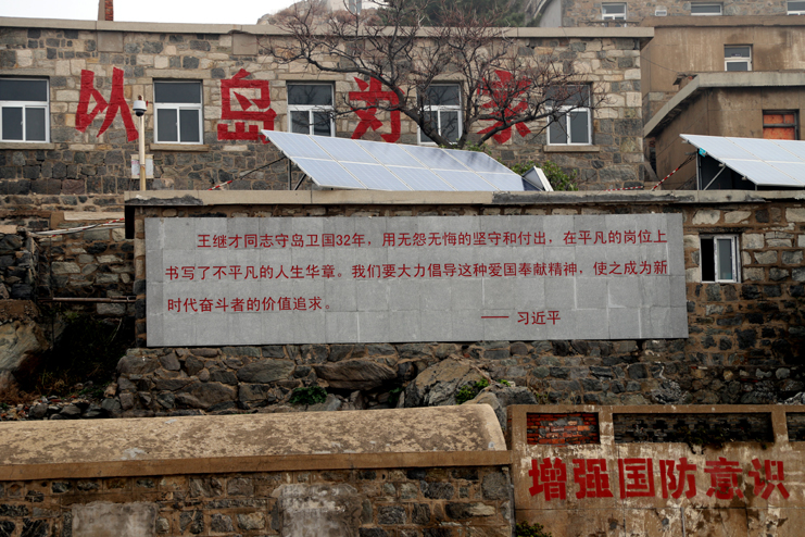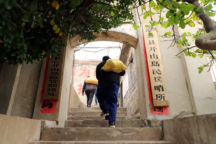 上午8點(diǎn),在發(fā)動(dòng)機(jī)巨大的轟鳴聲中,漁船緩緩駛離港口。近一個(gè)小時(shí)的顛簸,開山島出現(xiàn)在了視野里,由小到大,逐漸清晰。簡易碼頭上,守島民兵遠(yuǎn)遠(yuǎn)地沖著大家揮手,船上的人顧不上漁船的劇烈晃動(dòng),一個(gè)個(gè)扒著船沿?zé)崆榛貞?yīng)著,所有人的臉上都寫滿敬意和期待。漁船隨著海浪的節(jié)拍上下晃動(dòng)著,班組長們登上碼頭,就緊緊握住守島民兵的手,對(duì)他們守島衛(wèi)國,無怨無悔堅(jiān)守和付出的愛國奉獻(xiàn)精神表示欽佩。班組長們跟隨著守島民兵沿著王繼才夫婦他們當(dāng)年的巡邏路線,拾級(jí)而上,大家一邊感受巡島爬山的辛苦,一邊聆聽著守島民兵講解王繼才夫婦32年守島的艱難困苦和生離死別。