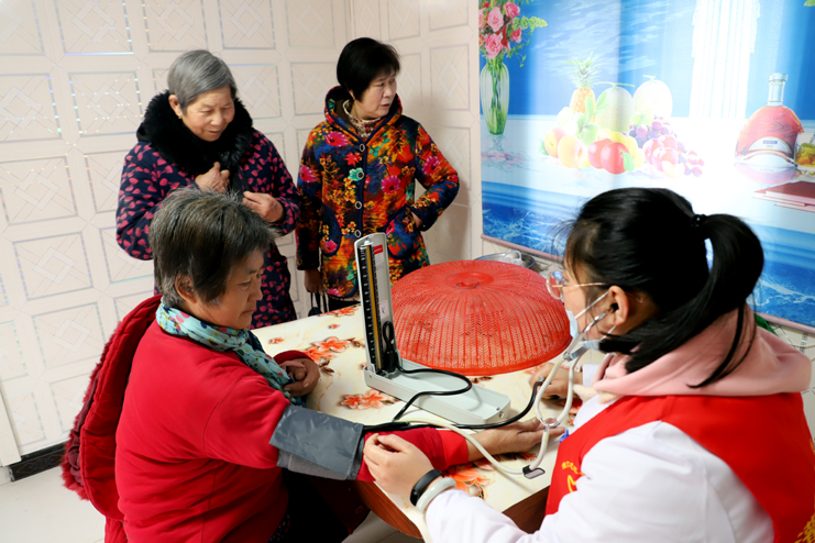 九點半,志愿者們來到中二圩社區(qū)新建點邱長松家,邱老跟老伴正在揀黃豆芽,準(zhǔn)備中午的飯菜??吹街驹刚邆兊牡絹恚瑑晌焕先藷崆榈赜鲩T來,招呼我們進屋,我們來到房間里,映入眼簾的是一張老式的八仙桌擺在室內(nèi)的一角,整個房間里擺設(shè)很簡單,可以看出來老人的艱苦樸素、勤儉節(jié)約的生活作風(fēng)。志愿者和老兩口拉起家常,詢問身體狀況和生活困難,并幫著大爺大媽揀黃豆芽。“我身體沒有什么大毛病,就是年歲大了,行動不方便,小孩都不在身邊,要感謝志愿者來看我們老兩口”,邱大爺誠懇的話語表達著心里的感謝。醫(yī)療志愿者為邱大爺跟老伴做了身體的簡單檢查,這時從外面走來幾位剛買完菜路過的大嬸、大媽們,她們聽說有醫(yī)療志愿者在邱大爺家,也紛紛過來讓志愿者醫(yī)療隊的醫(yī)生查查身體,“我家就住在隔壁,聽說有志愿者醫(yī)療隊來,我就想過來讓醫(yī)生幫我量量血壓,最近血壓或高或低的”,“剛在街上買菜回來,路過這,看都穿灌西志愿者紅馬甲,我就進來看看的,正好醫(yī)療隊在,我也給醫(yī)生查查看看。”大嬸、大媽們熱情的表達。