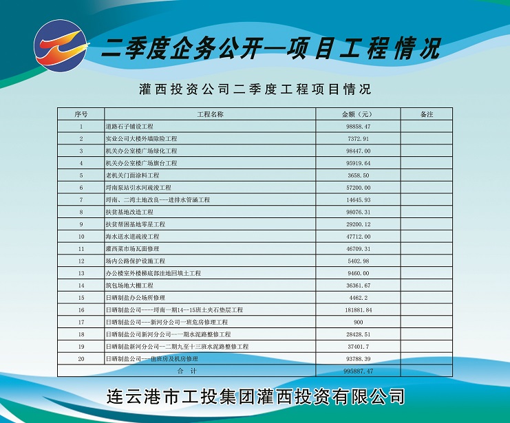 道路石子鋪設(shè)工程98858.47元;實業(yè)公司大樓外墻除險工程7372.91元;機關(guān)辦公樓廣場綠化工程98447.00元;機關(guān)辦公室樓廣場旗臺工程95919.64元;老機關(guān)門面涂料工程3658.50元;埒南泵站引水河疏浚工程57200.00元;埒南、二灣 土地改良—進排水管涵工程14645.93元;扶貧基地改造工程98076.31元;扶貧幫困基地零星工程29200.12元;海水送水道疏浚工程47712.00元;灌西菜市場瓦面修理46709.31元;場內(nèi)公路保護設(shè)施工程5402.98元;辦公樓室外樓梯底部洼地回填土工程9460元;筑包場地大棚工程36361.67元;日曬制鹽辦公場所修理4462.2元;日曬制鹽公司---埒南一期14—15班土夾石墊層工程181881.84元;日曬制鹽公司---新河分公司一班危房修理工程900元;日曬制鹽公司新河分公司—一期水泥路整修工程 28428.51元;日曬制鹽新河分公司一二期九至十三班水泥路整修工程37401.7元;日曬制鹽公司---值班房及機房修理93788.39元