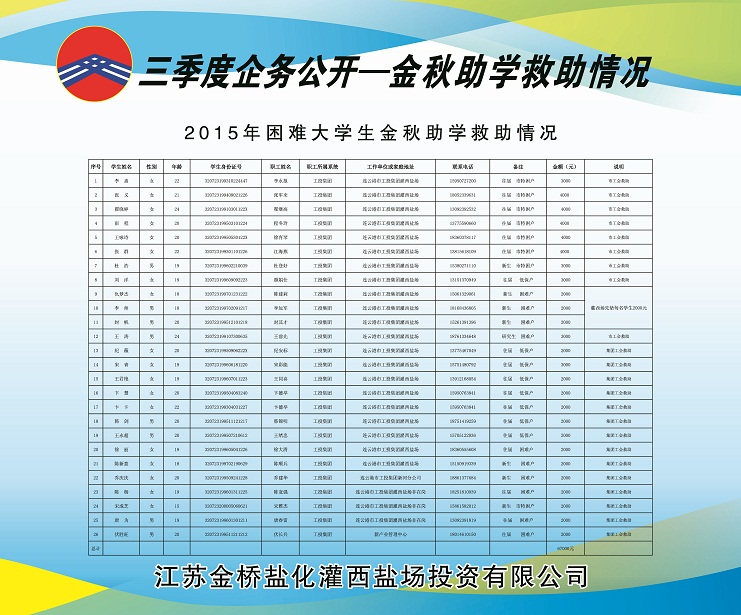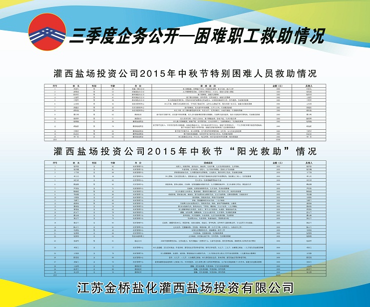 三季度,公司黨委積極做好走訪慰問(wèn)、送溫曖工作,灌西鹽場(chǎng)投資公司、日曬制鹽公司對(duì)30名困職工發(fā)放陽(yáng)光救助金30000元;對(duì)15名患重大疾病困職工及直系親屬發(fā)放救助金15000元;對(duì)26名困難大學(xué)生實(shí)行金秋助學(xué)金67000元。具體情況請(qǐng)查看公示展板。