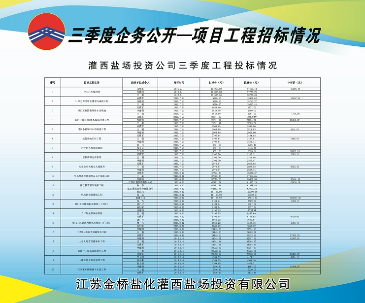第三次是在8月12日,招標(biāo)項(xiàng)目是:1、阜頭圩水庫(kù)池塘簡(jiǎn)易石子道路工程,中標(biāo)價(jià)為李建國(guó)35461.99元。2、廉政教育展廳裝修工程,中標(biāo)價(jià)為江蘇虹鑫裝飾有限公司61830.20元。3、機(jī)關(guān)新建籃球場(chǎng)工程,中標(biāo)價(jià)為南翼公司105841.03元。4、機(jī)柴門(mén)工區(qū)灘地機(jī)房修理(1~3班),中標(biāo)價(jià)為徐飛5869.21元。5、六圩閘渡槽閘板維修,中標(biāo)價(jià)為宋雅軍8739.92。6、柴門(mén)工區(qū)鈣液灘地機(jī)房修理(1~7班),中標(biāo)價(jià)為徐飛1583.76元。7、二灣3.4組石子道路修補(bǔ)工程,中標(biāo)價(jià)為宋雅軍27973.32元