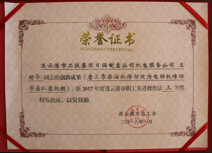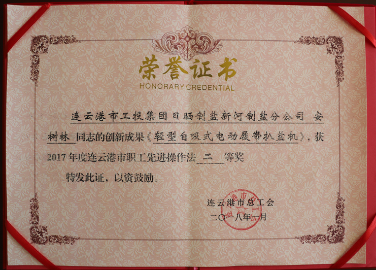 近日,日曬制鹽新河制鹽分公司安樹林同志的創(chuàng)新成果《輕型自吸式電動履帶扒鹽機(jī)》,被市總工會評為2017年度連云港市職工先進(jìn)操作法二等獎,日曬制鹽公司機(jī)電服務(wù)公司王緒華同志的創(chuàng)新成果《唐三零柴油機(jī)傳動改為電動機(jī)傳動帶鹵扒鹽機(jī)組》,被市總工會評為2017年度連云港市職工先進(jìn)操作法三等獎。(西工)