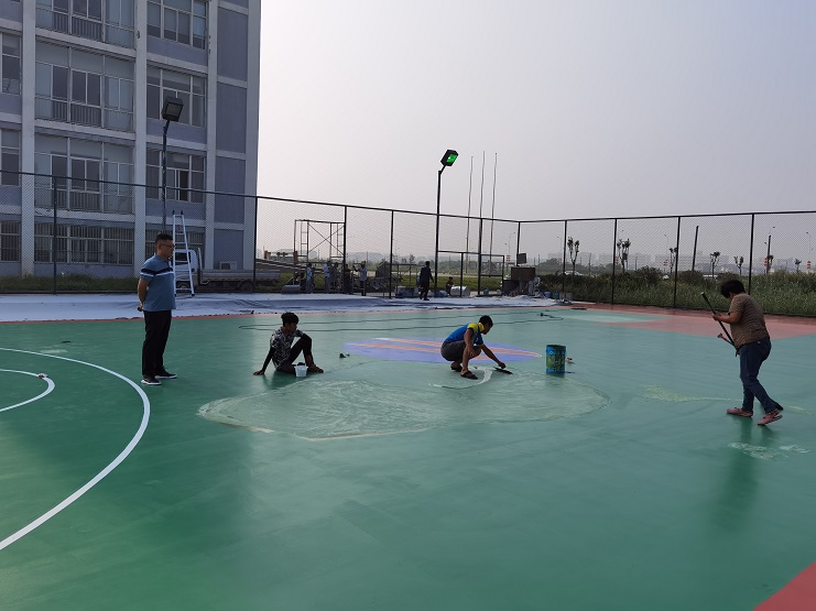 灌西籃球場(chǎng)總面積約510平米,附屬球場(chǎng)地面600平米,外圍護(hù)欄高3米。項(xiàng)目圍繞關(guān)鍵節(jié)點(diǎn)及重難點(diǎn),強(qiáng)化施工組織,統(tǒng)籌施工進(jìn)展。籃球場(chǎng)地面露天暴曬,溫度極高,仿佛蒸籠一般。施工人員在進(jìn)行鑿地、涂漆時(shí),僅幾分鐘的功夫,衣服從里到外被汗水浸濕,隨時(shí)有中暑的可能性,項(xiàng)目組把責(zé)任明確到個(gè)人,開(kāi)展班前安全教育活動(dòng),保證施工安全。施工單位南翼工程公司負(fù)責(zé)人錢明偉克服人員緊缺,工期緊迫等問(wèn)題,頂著高溫,始終奮戰(zhàn)在工程項(xiàng)目第一線。