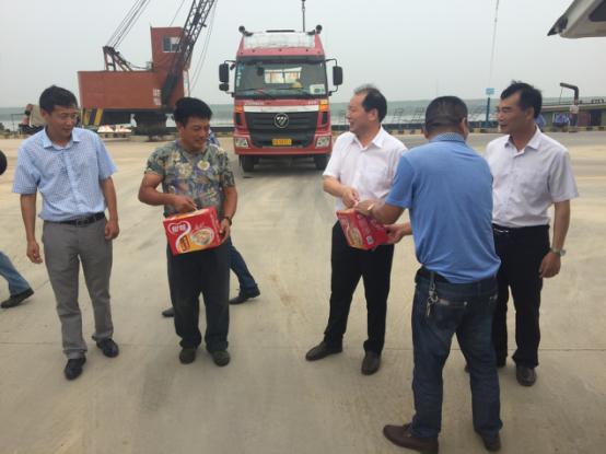 2017年7月18日星期二下午灌西鹽場(chǎng)投資公司領(lǐng)導(dǎo)到宵洋物流有限公司碼頭送清涼看望一線員工!在黨委書記董事長(zhǎng)王德志同志、總經(jīng)理李國(guó)文同志、工會(huì)主席王保平同志的帶領(lǐng)下親自到我宵洋物流有限公司碼頭看望一線員工,送清涼。炎炎夏日,酷暑當(dāng)頭一線員工永遠(yuǎn)沖鋒在前,領(lǐng)導(dǎo)的關(guān)懷更是永不停止!宵洋物流全體員工致謝?。ㄏ笸跞唬?br />