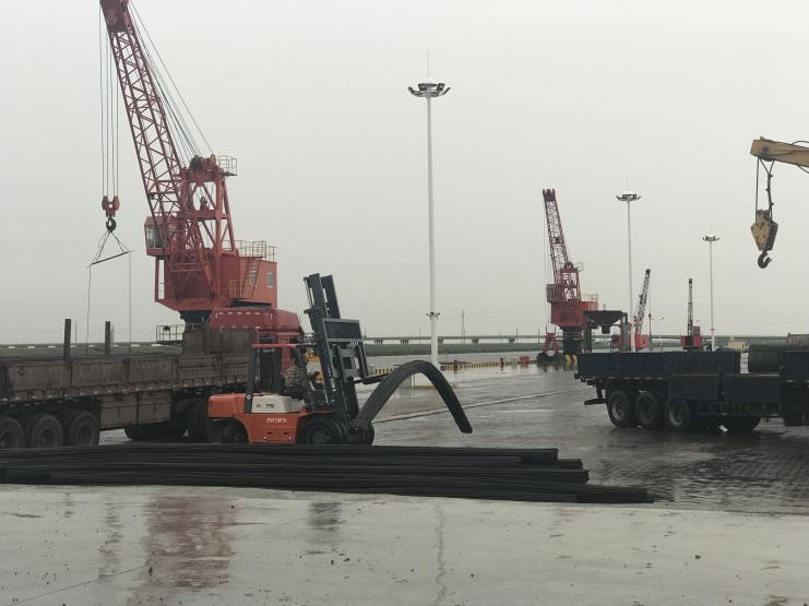 “戰(zhàn)高溫,迎酷暑”,宵洋碼頭從早上開(kāi)始就忙得如火如荼。裝載管樁的貨船進(jìn)入碼頭,工人們就開(kāi)始操作著塔吊,穩(wěn)穩(wěn)當(dāng)當(dāng)?shù)膶⒐軜?ldquo;放”入貨車(chē)。貨車(chē)裝載的盤(pán)螺,鋼筋也紛紛到碼頭場(chǎng)地上裝卸。一切工作都井然有序的進(jìn)行著。