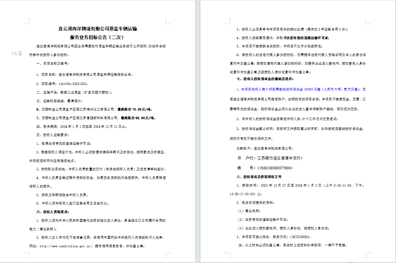 連云港宵洋物流有限公司原鹽車輛運輸服務業(yè)務招標公告(二次)