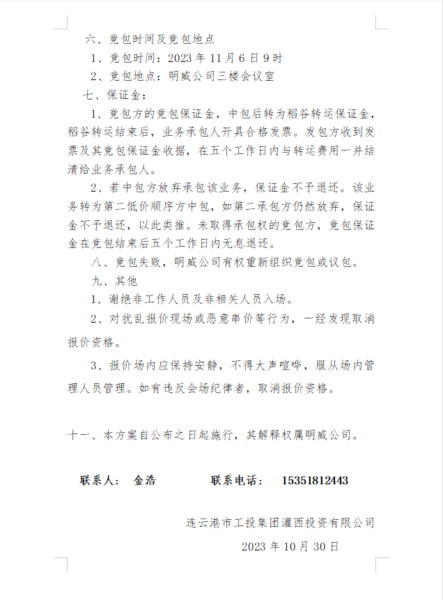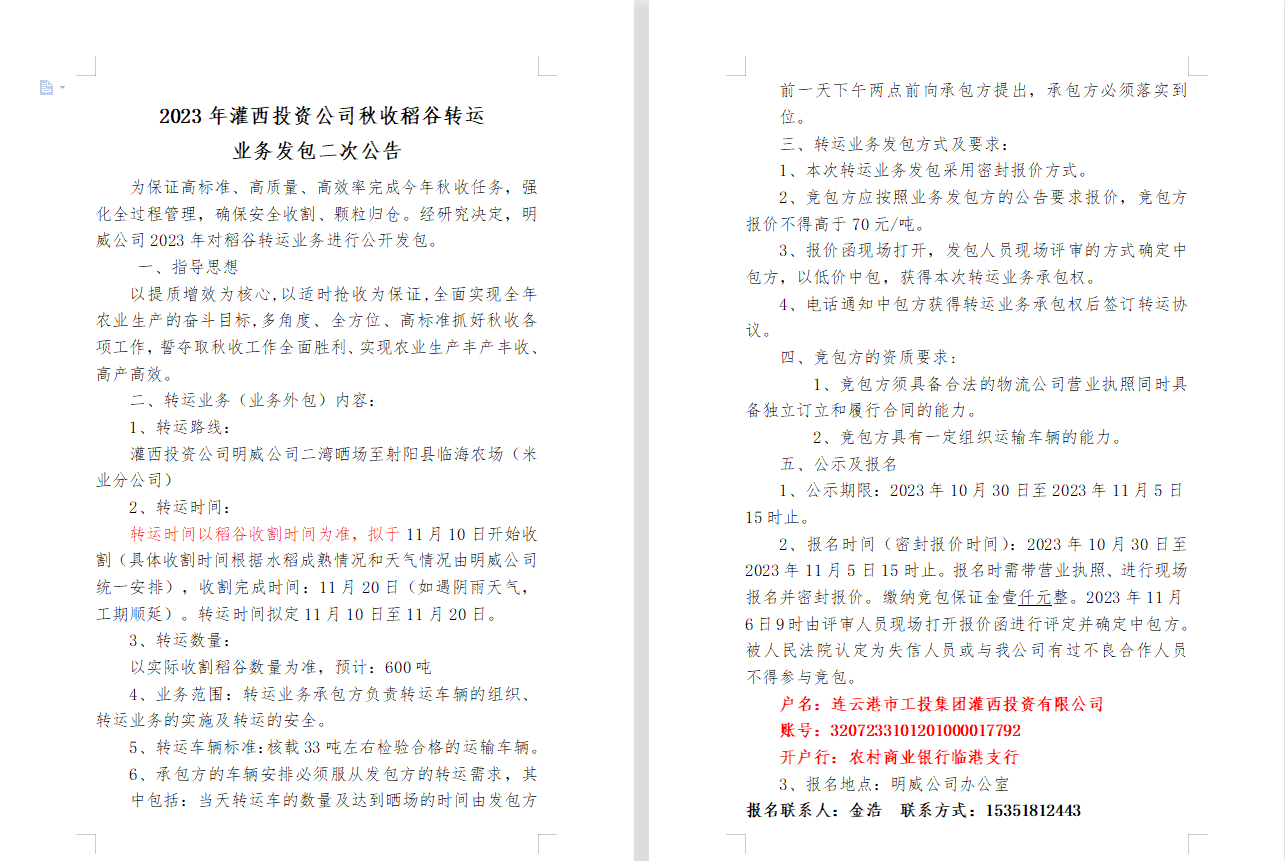 2023年灌西投資公司秋收稻谷轉(zhuǎn)運(yùn) 業(yè)務(wù)發(fā)包二次公告