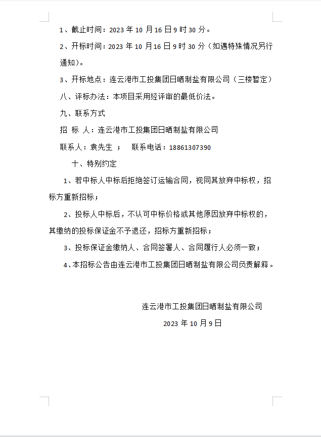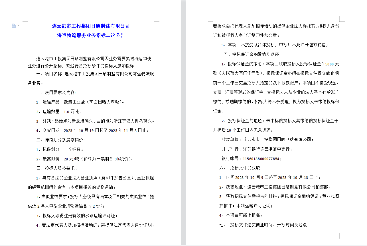 連云港市工投集團日曬制鹽有限公司 海運物流服務(wù)業(yè)務(wù)招標(biāo)二次公告