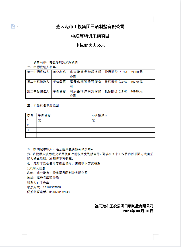 連云港市工投集團(tuán)日曬制鹽有限公司電纜等物資采購(gòu)項(xiàng)目中標(biāo)候選人公示