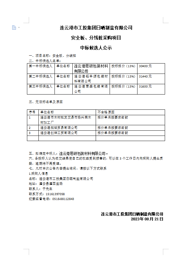 連云港市工投集團(tuán)日曬制鹽有限公司 安全板、分線樁采購項(xiàng)目 中標(biāo)候選人公示