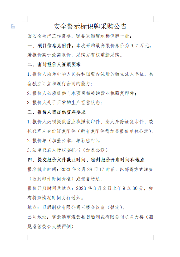 安全警示標(biāo)識(shí)牌采購公告