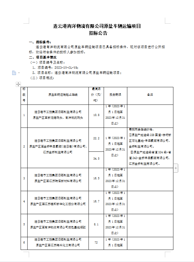 連云港宵洋物流有限公司原鹽車輛運輸項目招標公告