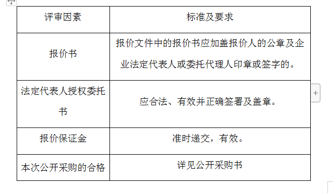 2、評(píng)審委員會(huì)將根據(jù)以下標(biāo)準(zhǔn)對(duì)各報(bào)價(jià)人進(jìn)行初步評(píng)審,有一項(xiàng)不符合要求的,作否決報(bào)價(jià)處理,不進(jìn)入詳細(xì)評(píng)審。