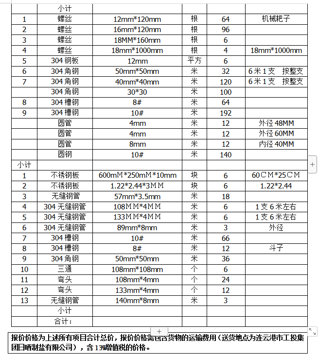 單價(含13%稅、運輸費用)。合同期間304不銹鋼單價不以304不銹鋼市場單價的變動而作任何調整。