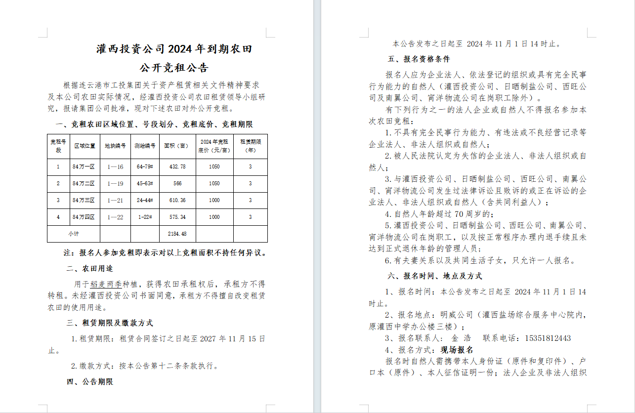 灌西投資公司2024年到期農(nóng)田公開競租公告