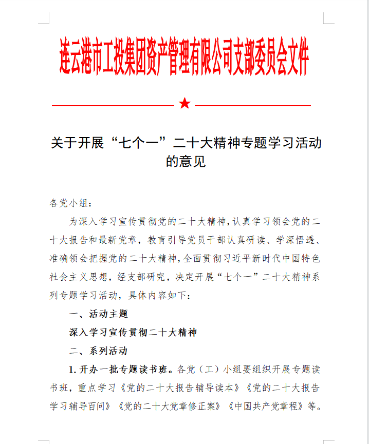 為在金融板塊快速掀起學(xué)習(xí)宣貫黨的二十大精神熱潮支部精心組織、積極籌劃,完善學(xué)習(xí)方案,創(chuàng)新學(xué)習(xí)教育形式,豐富黨建活動(dòng)載體,支部結(jié)合公司實(shí)際,專門制定《學(xué)習(xí)宣傳貫徹二十大精神學(xué)習(xí)方案》、《關(guān)于開展“七個(gè)一”二十大精神專題學(xué)習(xí)活動(dòng)的意見》。