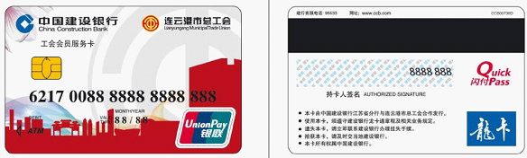 工會(huì)會(huì)員服務(wù)卡是一張集工會(huì)會(huì)員身份識(shí)別功能、會(huì)員服務(wù)功能于一體的工會(huì)會(huì)員實(shí)名服務(wù)卡。具體功能如下: (一)身份識(shí)別功能。工會(huì)會(huì)員服務(wù)卡具有工會(huì)會(huì)員身份識(shí)別功能,記載工會(huì)會(huì)員基本信息,全市工會(huì)會(huì)員實(shí)名制動(dòng)態(tài)管理。 (二)工會(huì)服務(wù)功能。工會(huì)會(huì)員服務(wù)卡具有劃入存貯工會(huì)所有幫扶救助資金的服務(wù)功能,持卡會(huì)員還可免費(fèi)或優(yōu)惠享受工會(huì)組織提供的困難幫扶、職業(yè)介紹、技能培訓(xùn)、心理咨詢、勞動(dòng)爭(zhēng)議調(diào)解等服務(wù)。 (三)金融服務(wù)功能。工會(huì)會(huì)員服務(wù)卡具有銀行借記卡的所有功能。 (四)社會(huì)服務(wù)功能。工會(huì)會(huì)員服務(wù)卡整合部分社會(huì)服務(wù)功能,通過工會(huì)與加盟機(jī)構(gòu)合作,為持卡會(huì)員提供醫(yī)療保健、文化娛樂、商業(yè)購(gòu)物、生活服務(wù)等領(lǐng)域的優(yōu)惠服務(wù)。(具體簽約單位見市總工會(huì)網(wǎng)站www.lygzgh.org/ka/) 下圖為工會(huì)會(huì)員服務(wù)卡卡樣,連云港市總工會(huì)發(fā)行的工會(huì)會(huì)員服務(wù)卡只此一種設(shè)計(jì),請(qǐng)認(rèn)準(zhǔn)連云港市總工會(huì)logo和工會(huì)會(huì)員服務(wù)卡字樣,若同此圖不同均非工會(huì)會(huì)員服務(wù)卡。