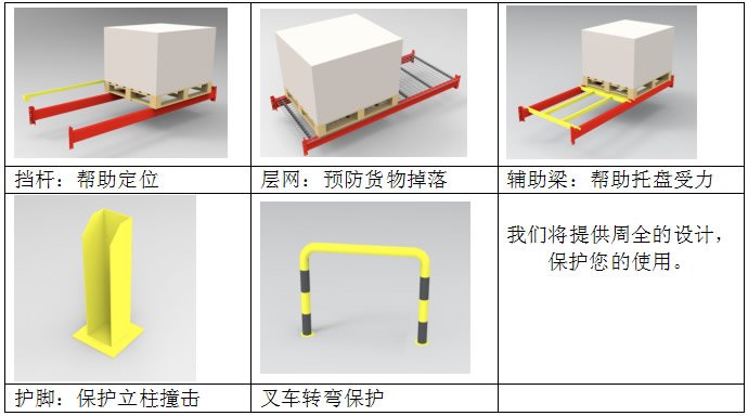 我們也將為您規劃倉庫的合理布局,和選擇適合的配件。 我們將根據您提供的信息,選擇適合的材料規格。 產品所使用的安全配件: