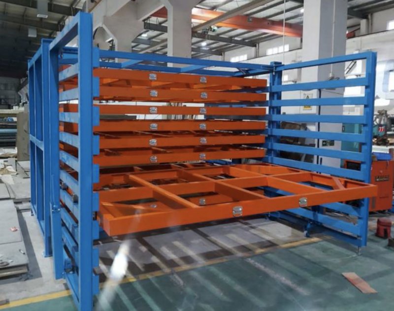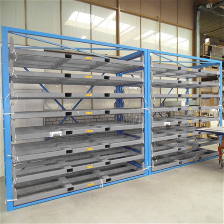 大型板材存放貨架帶有自動移動框的移動式貨架緊湊,方便定位金屬板位置,移動框架帶有滑輪和搖臂,選好目標板材之后移動懸臂即可創造空間獲取板材。移動框架固定在兩條平行軌道上,通過移動框架,人員方可進入空擋獲取金屬板是一種簡單安全的搬運方法。