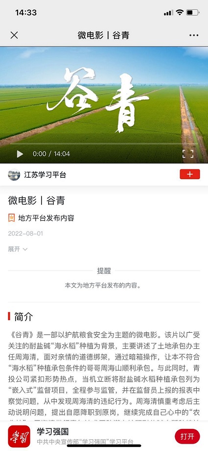 近日,由連云港市工投集團(tuán)青口投資公司自編自演的微電影《谷青》入選學(xué)習(xí)強(qiáng)國---江蘇學(xué)習(xí)平臺(tái)。