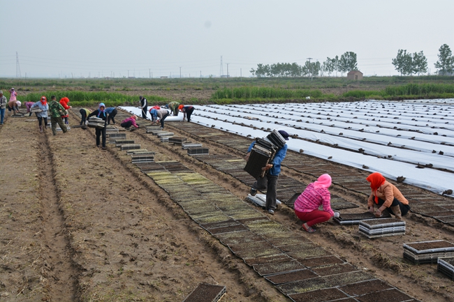 種糧大戶俞正猛正在張羅工人們擺盤(pán)育秧。運(yùn)盤(pán)、擺盤(pán)、覆膜、壘土,工人們或快速或仔細(xì)地高效運(yùn)轉(zhuǎn)著,三輛三輪車(chē)前后停在田埂上,車(chē)上整齊的擺放著數(shù)以萬(wàn)盤(pán)的暗化苗,這些暗化苗來(lái)自生態(tài)種養(yǎng)中心育秧大棚,硬盤(pán)里面一層軟盤(pán)放入基質(zhì),撒入稻種,在大棚里通過(guò)一定的溫度和濕度的科學(xué)管理,出芽后運(yùn)送到各個(gè)田頭。男工負(fù)責(zé)把硬盤(pán)在秧板上均勻放好,再由心細(xì)的女工把軟盤(pán)從硬盤(pán)上拿出擺放在秧板地上,一條秧板擺完,立刻蓋上無(wú)紡布薄膜,就地挖土壓住防風(fēng),保護(hù)好秧苗不被曬傷。空的硬盤(pán)運(yùn)到田邊由專(zhuān)人整理回收最后運(yùn)回生態(tài)種養(yǎng)中心。全部擺完以后上好水,一整套工序就算完成。不到一天時(shí)間,一萬(wàn)多盤(pán)秧盤(pán)已經(jīng)被工人們?nèi)粩[完。