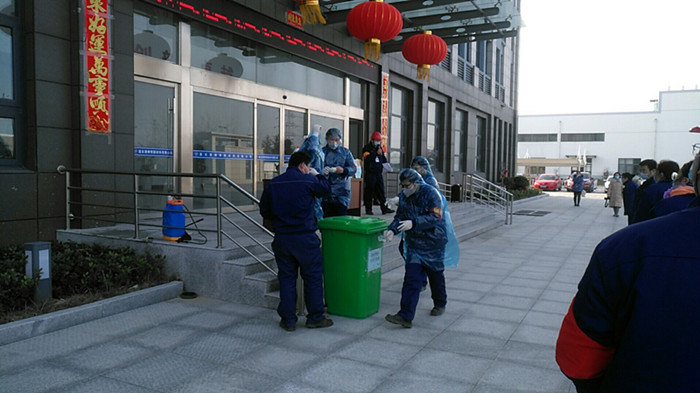 乙班班長封安帶領(lǐng)員工前往生產(chǎn)現(xiàn)場進行消殺,對發(fā)熱員工可能出入和接觸的工作現(xiàn)場、操作臺、更衣室、原輔材料、工具等進行徹底消毒。生產(chǎn)設(shè)備部王勇、王卉啟動調(diào)查程序,詢問其他員工,了解發(fā)熱員工行動軌跡和密切接觸情況。